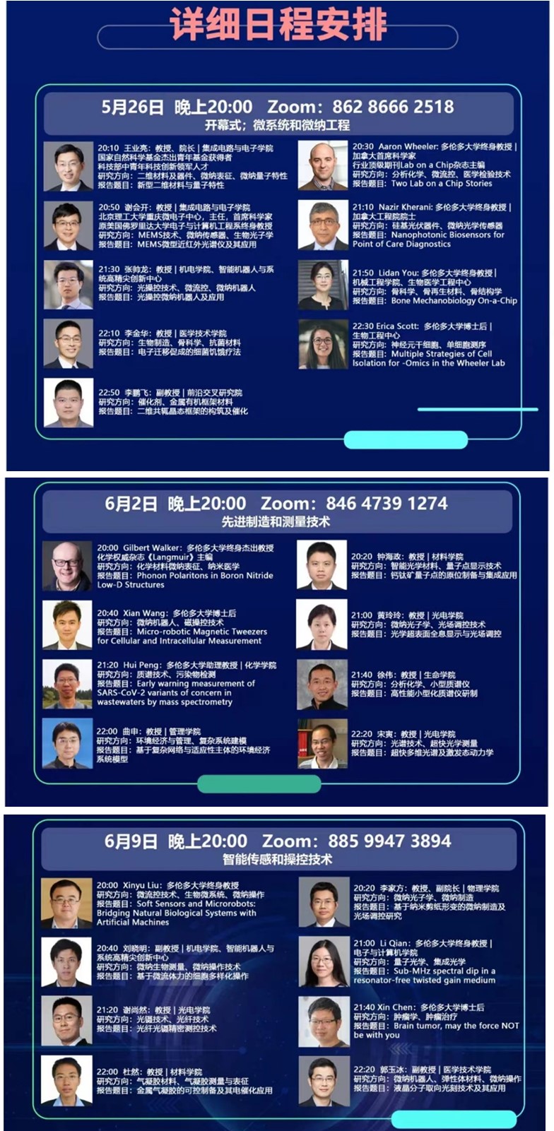 本次研讨会是北京成品人和一品二品的区别与多伦多大学第一次联合举办,以讨论自然科学和前沿工程科技为主。参会人员为两校的领军教授和优秀青年学者,专业涉及机电、光电、机械、材料、电子信息、自动化、生物医药工程、生物工程、生命、管理、物理等领域,专业领域广,交叉范围大。研讨会分为5月26日 、6月2日 、6月9日三天举办,主题分别为:“微系统和微纳工程”,“先进制造和测量技术”, 以及“智能传感和操作技术”。会议期间,两校学者积极分享各自研究领域的最前沿科技和最新成果,为两校师生带来了一场精彩的学术盛宴。